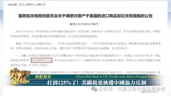 中国针对美国进一步调高向中国征收的对等关税做出反制,国务院关税税则委员会发布公告,调整此前公布的加征关税税率,由84%提高到125%。同时,公告表示,鉴于在目前关税水平下,美国输华商品已无市场接受可能性,如果美方后续对中国输美商品继续加征关税,中方将不予理会。