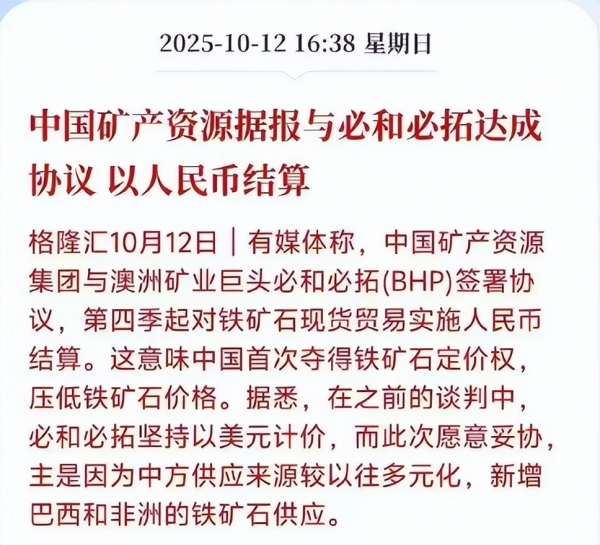 现在有了统一的声音,还能拉来巴西、非洲等新供应商,澳洲矿企也得低头。定价权、结算权,咱中国一把抓。