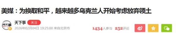 一开始,全民一句话,领土一块不能少。基辅的调查数字在那,八成以上的人拒绝任何让地的谈法。那时候,敌人刚进门,心是硬的,火也是旺的,谁松口谁就被骂。