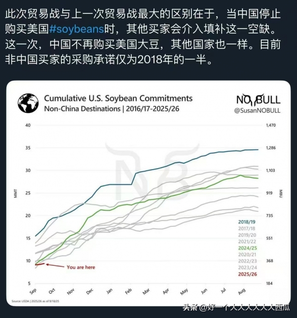 可就算是出口已经是如此危机局面了,特朗普政府的应对方案仍是"补贴"。9月25日,特朗普在白宫宣布计划用部分关税收入补贴豆农,声称"这笔钱对农民来说是不小的数目,最终大家会发财的"。但是这样的补贴就如同"画大饼都",美国豆农们已经不再轻信了。堪萨斯农民联盟负责人直言:"上一次补贴,大部分钱被大型农业公司拿走,我们小农户拿到的不到十分之一。现在政府又说'再等等',可我们等不起了--农场贷款快到期,家人要吃饭,再拖下去只能破产。"。这真切朴实的语言只说明了一个问题,美国大豆主产区现在是真的水深火热,不少传承数代的家庭农场面临"断代"和破产的风险。