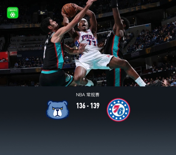 北京时间12月31日NBA 常规赛,孟菲斯灰熊对阵费城76人。本场双方双方对攻持续拉锯紧咬比分,半场双方72平,末节76人埃奇库姆四记三分取得领先,但灰熊莫兰特站出来拖入加时,加时赛最后时刻76人埃奇库姆三分准绝杀,最终76人139-136加时险胜灰熊。