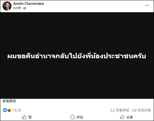 阿努廷11日晚在其个人脸书(Facebook)发文称:"我请求将权力交还给泰国人民。" 泰国政府账号在X平台上发文表示,阿努廷已正式向泰王提交解散下议院的请求,并指出:"如果获批,大选必须在45至60天内举行,最迟不得晚于2026年2月8日。"