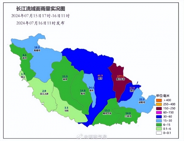 面雨量:长江流域唐河上游177.9毫米,淠河、白河面雨量46到53毫米。