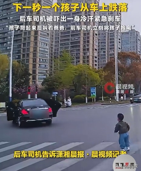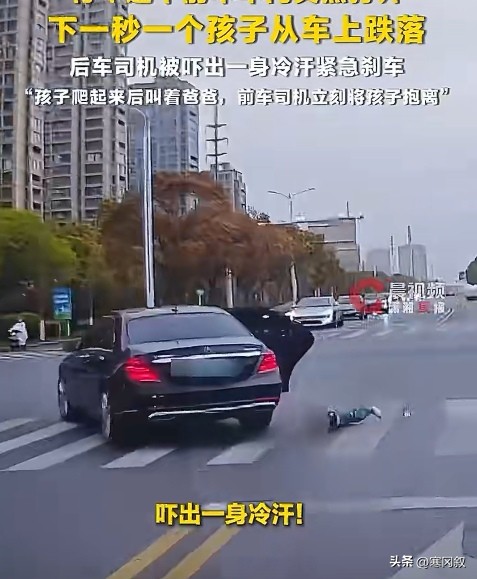 这事儿最离谱的细节在哪?这可不是什么保姆没关好门,开车的可是娃亲爹啊!小家伙结结实实摔在柏油路上后,自己哆哆嗦嗦地爬了起来,扯着嗓子直喊"爸爸"。这声爸爸喊得估计比什么都刺耳。前车这位当爹的这时候才如梦初醒,赶紧踩停跑过去把孩子一把抱走。