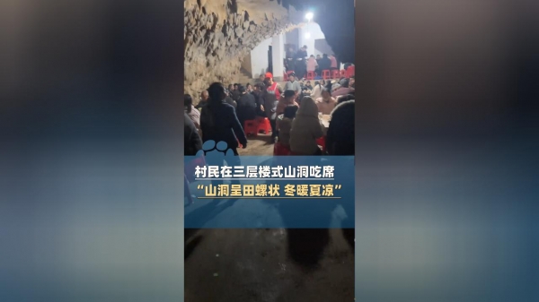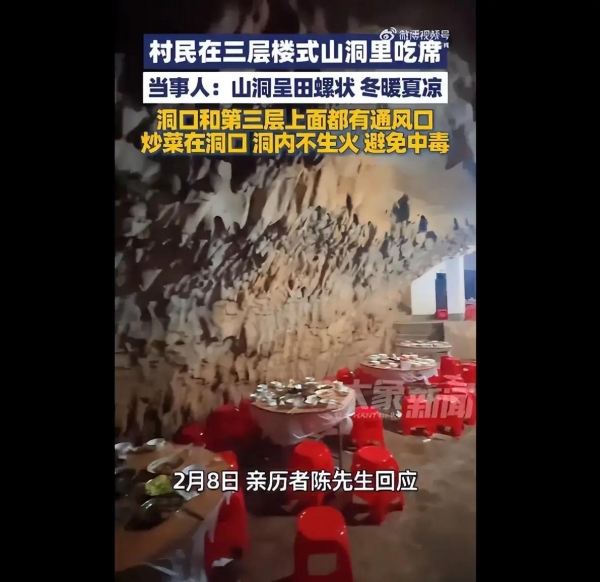 2月7日,湖南永州某村村民在三层楼式山洞里吃酒席的视频走红。
