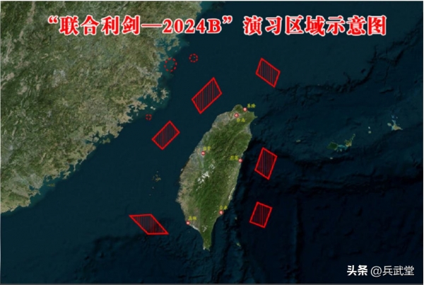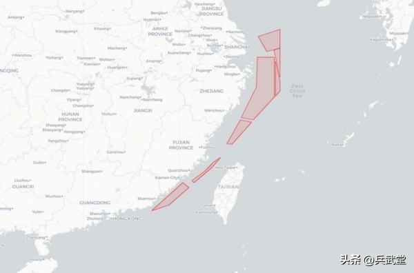 根据报道中发布的图片显示,可以看到沿着东南沿海附近的海岸线,设立了大大小小一共七个不同的红色区域。相信大家一定还记得之前联合利剑A和B都是设立了这种红框标注的演习区域,但之前的区域小部分在沿海区域,大部分都在是围绕在台岛周围的,也称为"锁台"。