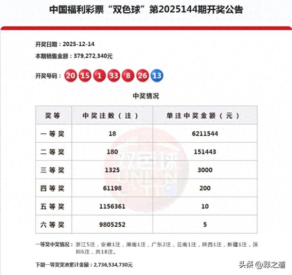 今晚双色球25144期开奖出炉了,真的不鸣则已,一鸣惊人!本期开奖井喷啦,本期一等奖18注,二等奖180注,而三等奖1325注。这样的开奖结果,还真的出乎意料,最近双色球的奖池开始回升,来到了27.3亿。本期的开奖号码难度不大,1枚重号,只是二等奖和三等奖都很可惜,一号之差,错失一等奖621万。
