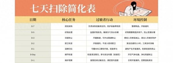 对大扫除感到无从下手?别慌!刘昀主任整理了一份七日分步扫除计划,将清洁任务合理分散,每天专注1至2个区域,既能减轻身体负担,又能有效控制过敏原暴露风险。跟着计划走,清洁不再慌: