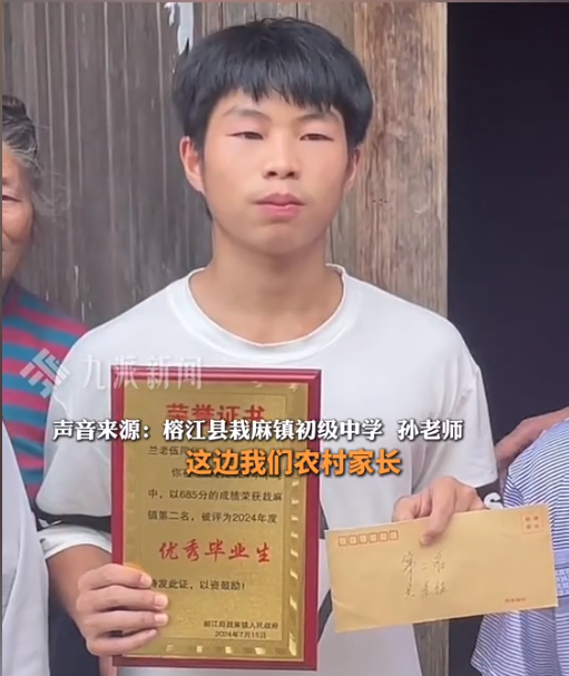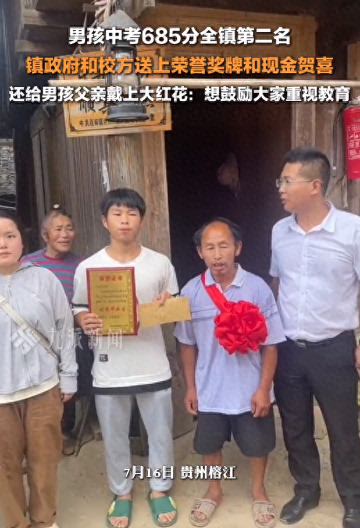 7月16日,位于中国贵州省黔东南州的榕江县栽麻镇,一位名叫兰同学的初中生以优异的成绩--中考总分685分,荣获了该镇的第二名佳绩。为了表彰他的出色表现和对地方教育事业的贡献,学校的教师团队以及政府相关部门的工作人员共同为他颁发了荣誉证书,同时还为他的父亲佩戴上了象征荣耀的大红花进行庆祝。