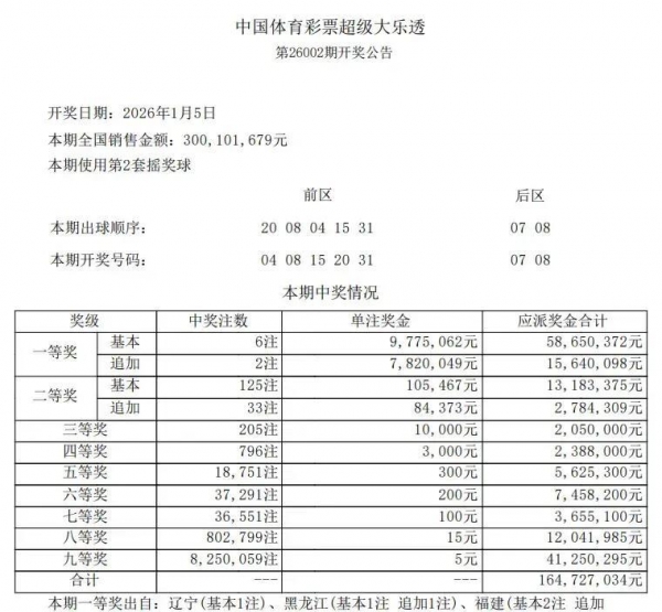 26002期大乐透结果来了:前区4、8、15、20、31,后区7、8,和值15点。