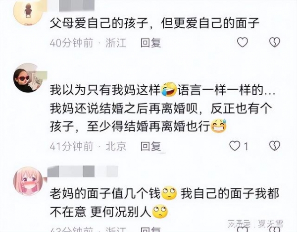 还有人称,竟然与自己妈妈说的一模一样,是相同的话术.,自己是有切身体会,催婚到最后,父母真的会人身攻击的。当时是真的很生气,但事后换位思考,也稍微能理解,这大概是当父母的爱子心切吧。