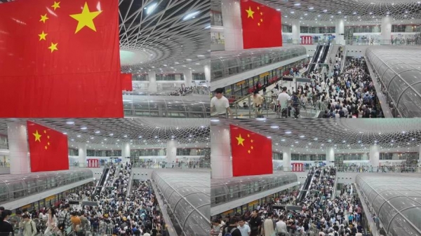 深圳地铁岗厦北站被称为"深圳之眼",是深圳首个一次建成的四线交汇站点,包括2号线、10号线、11号线、14号线的站内换乘。岗厦北枢纽内核心换乘区的中心景观,是以"深圳之眼"为主题,引入费马螺旋线双向延伸,体现了深圳"汇聚、包容、国际化"文化特征。因为高颜值,吸引了不少市民游客前往拍照打卡,成为深圳地铁全网爆火的"网红车站"。此次悬挂大型国旗,隆重的仪式感让每位乘客感受到满满的爱国热情。