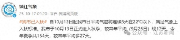 镇江市10月1日正式入秋