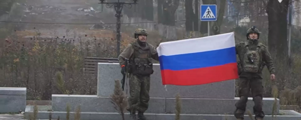 俄军士兵在控制红军城后展示俄罗斯国旗 俄罗斯卫星通讯社