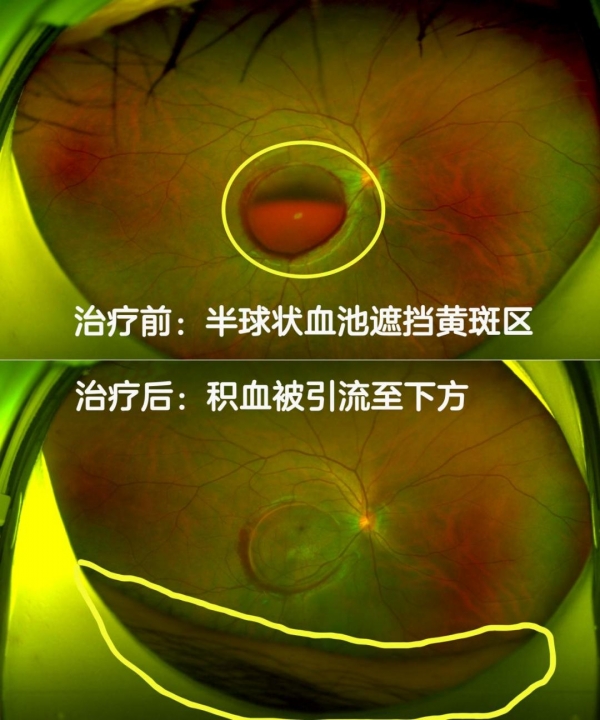 而对于出血量大,像小程一样,形成半球状血池遮挡黄斑区,严重影响视力者,则需要进行积极的干预治疗。郑宏华主任特别指出,在出血早期,积血还是液体状态时可通过YAG激光击穿血池引流,使积血从黄斑区移位。但是,一旦错过时机,积血凝固成块,则只能通过玻切手术治疗。