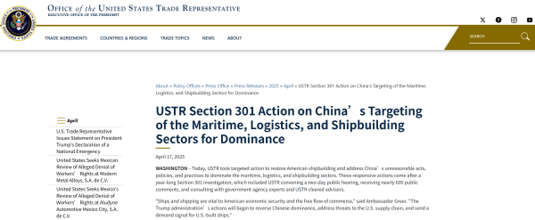 Within weeks, Chinese port authorities also began reviewing access for U.S.-affiliated shipping companies, delaying several clearances on "technical grounds." Meanwhile, according to the Section 301 investigation released by the U.S. Trade Representative on April 17, Washington announced that from October 14 it would impose an additional port-service fee on vessels owned or operated by Chinese companies, Chinese-flagged ships, and vessels built in China, citing unfair competition in maritime, logistics, and shipbuilding.