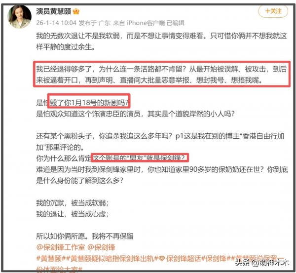 同时,黄慧颐还点名了某个长达十几年的黑粉,质问对方为何那么肯定"男友"就是保剑锋,又为何那么清楚他们家里事。对此,黄慧颐喊话保剑锋夫妻俩:"如你俩所愿,将不再保留"。