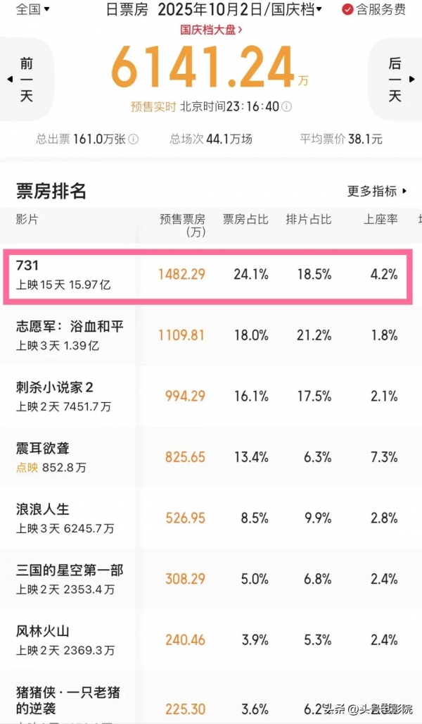 从口碑到票房,国庆档新上映影片普遍表现一般,没一个全方位能打,已经上映快半个月的电影《731》日票房暂时还是第一。