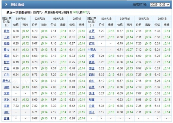 而截至目前,2025年第25次调价完毕后,标准汽油7585元/吨,标准柴油6600元/吨,因此,相比去年峰值,汽油累计下降1325元/吨,柴油下降1275元/吨,折合升价,国内92/95号汽油,部分油品,油价大降1.13元/升!比如,去年春节前北京95号汽油8.27元/升,截至目前报价7.14元/升,累计下降1.13元/升,按照私家车50升容积,加满一箱油,估计少花56.5块钱……