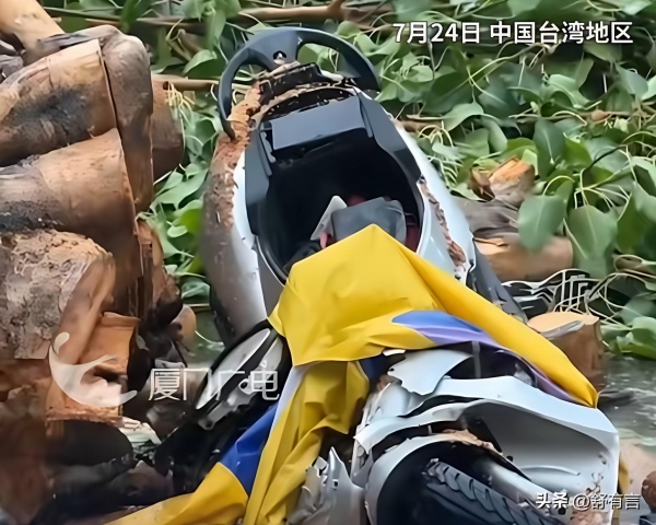 电瓶车被树木砸得稀巴烂,车头直接变形了,太危险了,一颗成年树木的重量不是一辆电瓶车可以承担的。