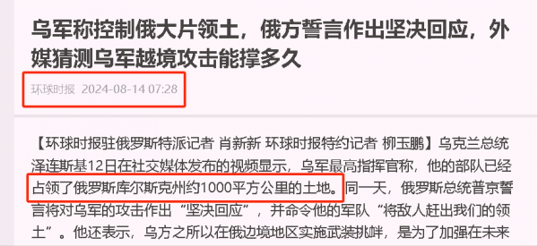 2024年8月14日,《环球时报》发文称,泽连斯基在乌军攻入俄罗斯后,首次公布了一段视频。乌军指挥官兴奋地表示,攻击进展非常顺利,已经打了俄军一个措手不及,目前已经占领了俄罗斯大约1000平方公里的土地。