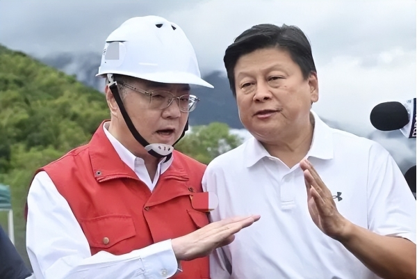 24日,台行政机构负责人卓荣泰(左)和中国国民党团总召傅昆萁在花莲视察灾情。