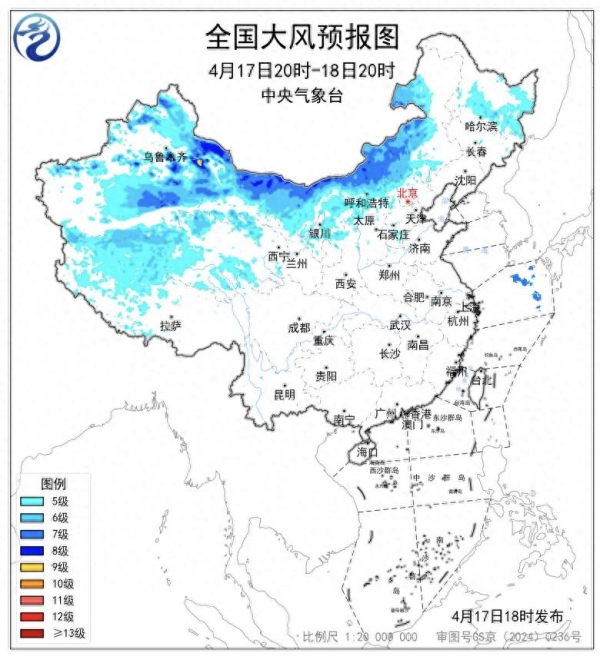 4月17日18时,中央气象台发布大风蓝色预警,未来24小时(17日20时至18日20时),我国北方多地将遭强风袭击 。