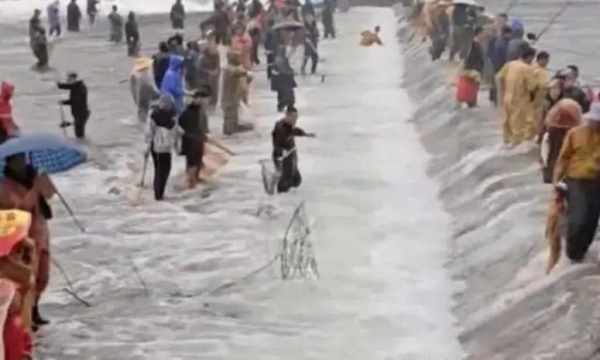 "这阵仗几十年没见过!"家住水库旁的韩先生站在堤坝上,指着河道里密密麻麻的人群直咂嘴。视频画面中,男女老少或踮脚站在及膝的河水里,或趴在岸边石阶上,工具从专业渔网到塑料盆、编织袋应有尽有。有人一网兜下去捞起三条鱼,兴奋得举过头顶;有人结伴用渔网拉起"人墙",截住顺流而下的鱼群;更有人徒手抓鱼,滑倒后浑身是泥仍大笑不止。