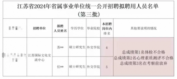 近日,江苏一省属事业单位招聘前三名均未录取,最终,综合成绩第四和第五名的考生以递补的形式入职该单位。这个事情在网上引起了网友的热议。