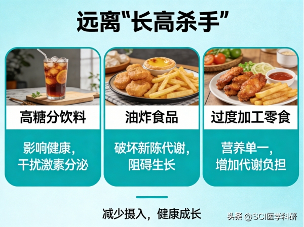 远离"长高杀手":减少甚至避免高糖分饮料、油炸食品、过度加工的零食。这些食物不仅影响健康,还会干扰正常的激素分泌和新陈代谢。