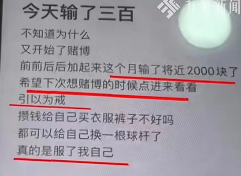 在男子手机的备忘录里记载了这样的一段话:"今天输了三百,不知道为什么,又开始了赌博,前前后后加起来这个月输了将近2000块了,希望下次想赌博的时候点进来看看,引以为戒,攒钱买衣服裤子不好吗?都可以给自己换根球杆了,真的服了我自己。"