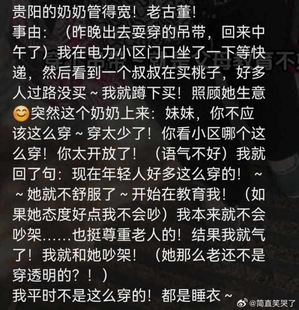 很多网友看到这个事件后,都纷纷表示:"这老太太是在街上给大家上道德课吗?我只想说,穿什么衣服与家教无关吧!"还有人调侃说:"我觉得她是见不得别人凉快,想拉大家一起热。"这种幽默的评论让整个事件变得轻松,让更多人参与到讨论中。