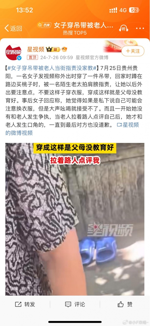 在贵州贵阳,一名女子因为穿了一件吊带上街,被一位陌生老太太当街指责。这位老太太不仅拍了女子的肩膀,还开口说出"穿成这样就是父母没教育好"这样的评论。想象一下,当你在炎热的夏天选择穿着轻松些的衣服时,却被人这样评论,内心的震撼可想而知。