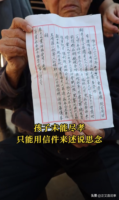 唐爷爷在侄子的安慰下,他才强忍住悲伤,颤抖着手从志愿者那里接过一张信纸,轻轻的展开,上面是唐爷爷的字迹,一笔一划工整的写着祭文。