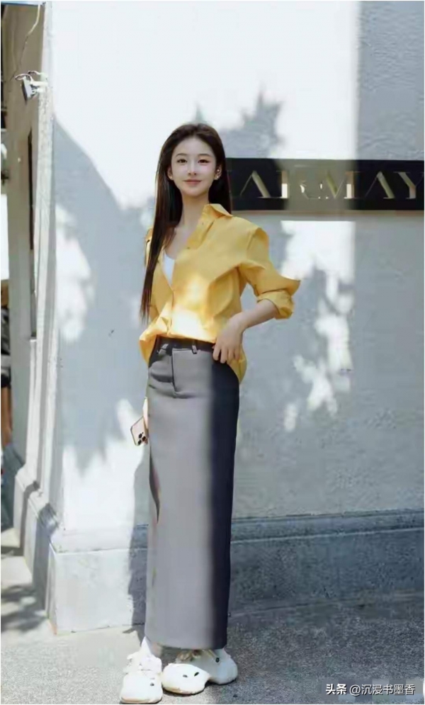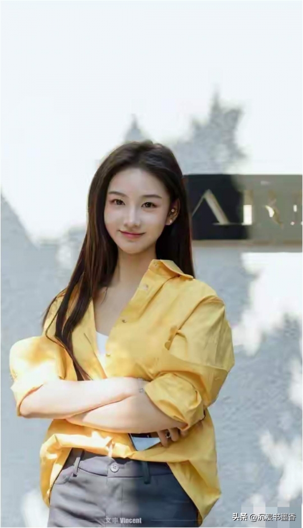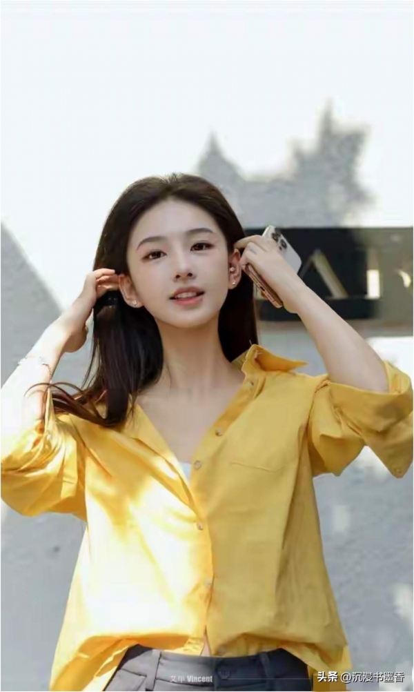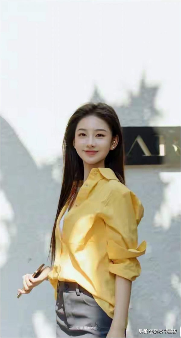 黄玉瑶的鹅蛋脸在阳光下更显线条柔美,深棕色长发随意散落肩头,与亮黄色衬衫形成巧妙撞色。她侧身站立时脸部轮廓被光线勾勒得愈发立体,微微卷起的袖口露出纤细手腕,交叉于胸前的双臂姿态松弛又不失优雅。最打动人的是她凝望镜头时的神情--眼睛像含着一汪清泉,嘴角自然上扬的弧度恰到好处,既有少女的俏皮又不失温婉气质。