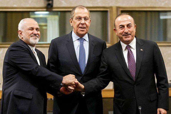2018年,扎里夫与时任俄罗斯外交部长拉夫罗夫(中)和时任土耳其外交部长恰武什奥卢(右)握手。
