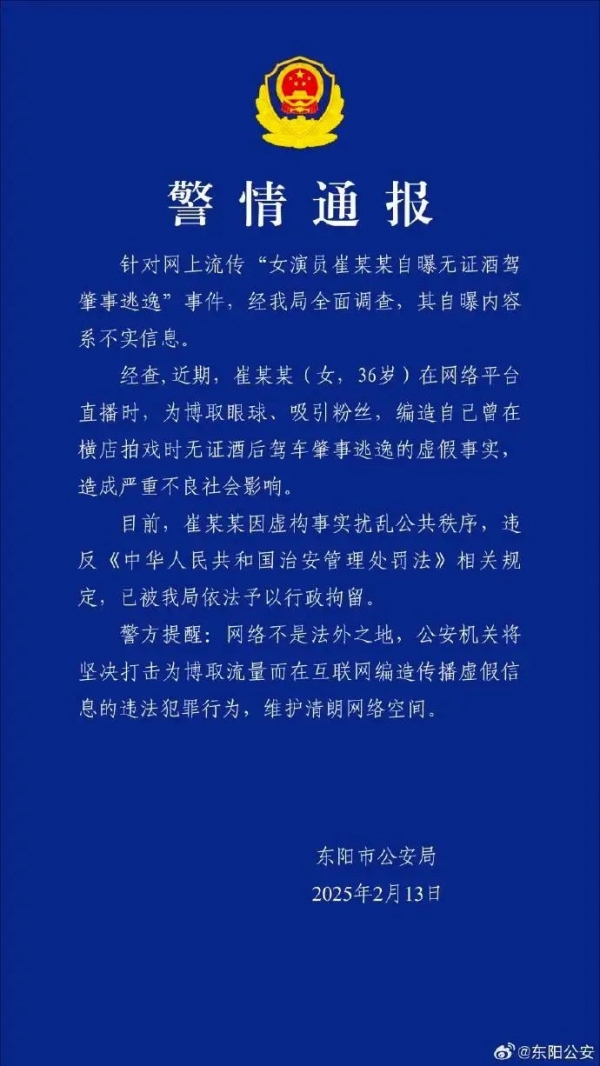 警方表示,经查,近期,崔某某(女,36岁)在网络平台直播时,为博取眼球、吸引粉丝,编造自己曾在横店拍戏时无证酒后驾车肇事逃逸的虚假事实,造成严重不良社会影响。