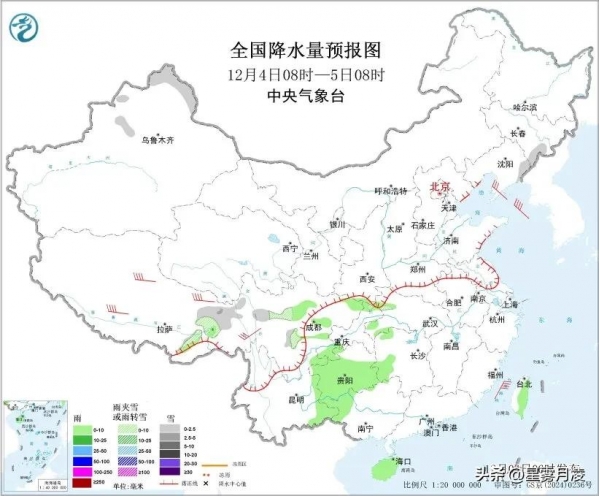 12月4日到5日一早,新疆北疆北部、吉林东南部、辽宁东北部、西藏东部、川西高原中部会有小到中雪或雨夹雪。西南地区东南部、湖北西部、湖南西部、广西西部、海南岛、台湾岛东部会有小雨,局地中雨。辽东半岛、西藏中北部会刮5~7级风,阵风能冲8级,沿海海域风力更大,渤海、渤海海峡、黄海北部和中东部海域会有6~7级风,阵风8~9级,海上作业得多留意安全。