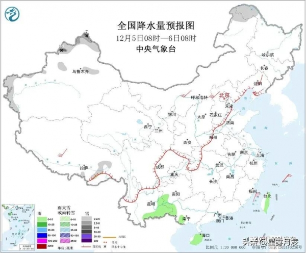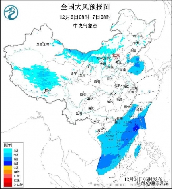 12月5日到6日一早,内蒙古东北部、黑龙江西北部、新疆北疆北部和南疆西部山区、西藏东南部依然有小到中雪或雨夹雪,新疆北疆北部局地会下大雪或暴雪,降雪量10~13毫米。贵州西南部、云南东部、广西西部、海南岛大部、台湾岛东部有小雨,内蒙古中部、河北北部、辽宁中东部、西藏北部有5~6级风,阵风7级,台湾海峡以及南海东部海域风浪也不小。