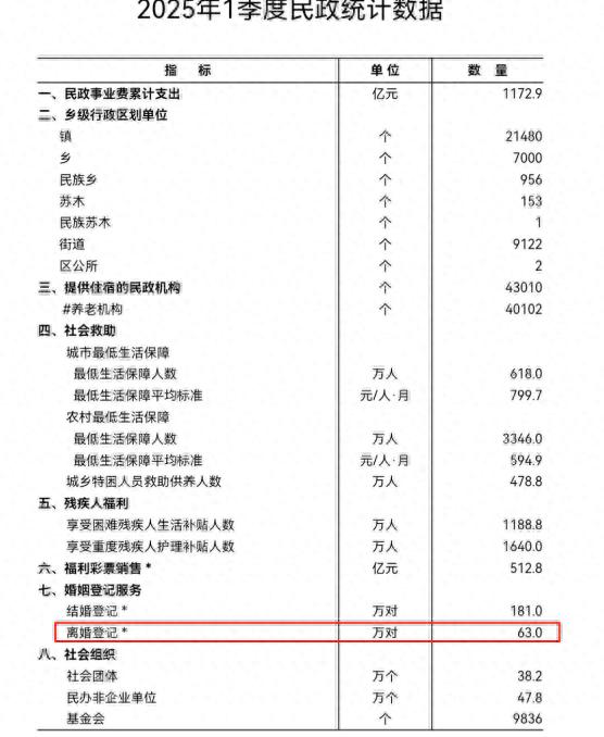 民政部最新统计显示,2025年第一季度全国离婚登记达63万对,同比激增5.7万对,离结比(离婚对数与结婚对数之比)攀升至34.8%。