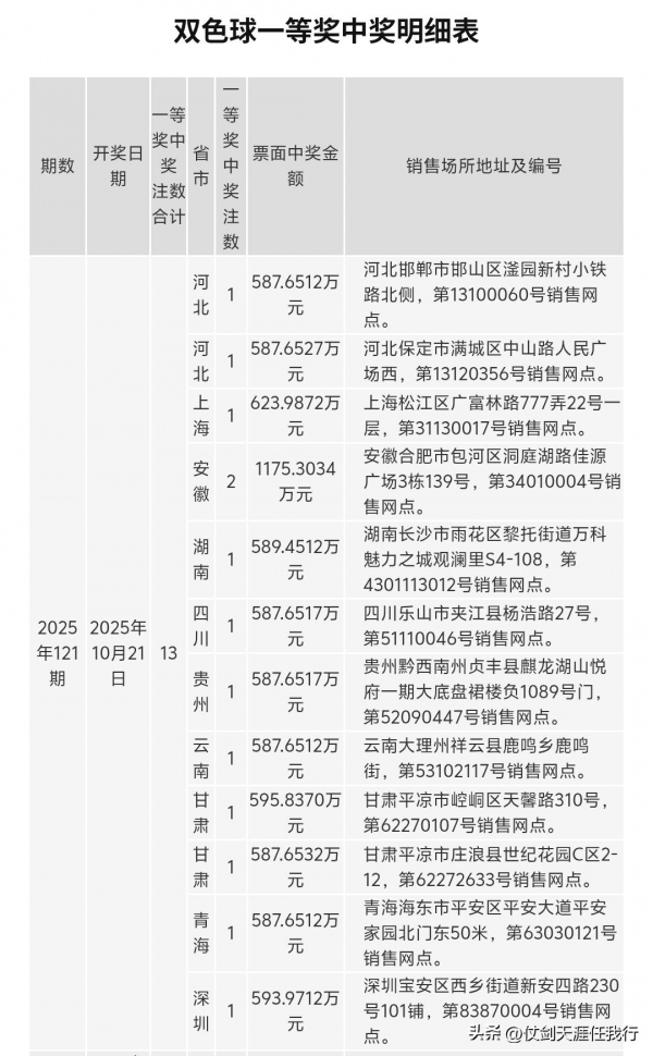 13注头奖出自12个站点,其中青海海东,甘肃平凉,云南大理,贵州黔西南,四川乐山,河北保定,邯郸的头奖实票都出自单式票。