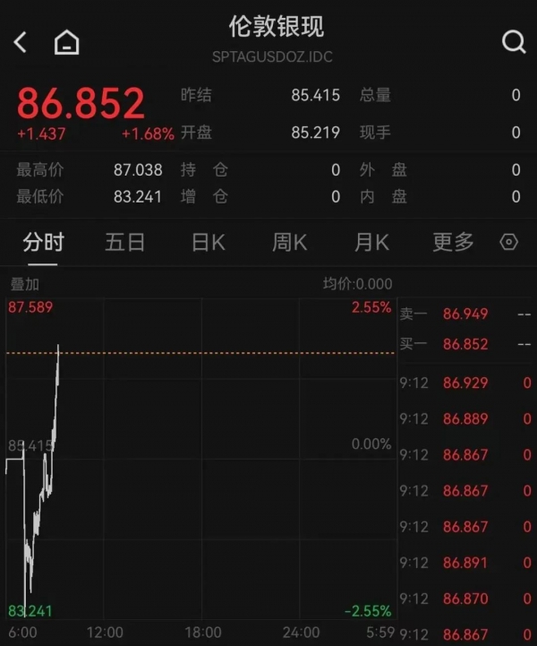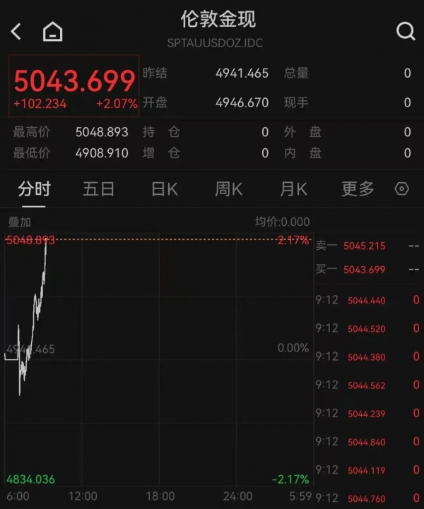 现货黄金、白银均持续走高,截至发稿,现货黄金突破5040美元/盎司,日内涨2%;现货白银涨1.68%,现报86.852美元/盎司,此前一度跌超2%。