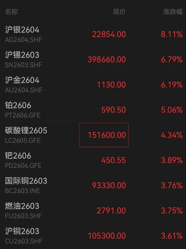 截至发稿,沪银涨逾8%,沪金、沪锡涨超6%,铂涨超5%,沪铜、国际铜等涨超3%,BR橡胶、沪镍等涨超2%,纯苯、沪铝等涨超1%,棕榈油、纯碱等小幅上涨。