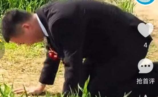 新郎下车后,朝父亲的坟头大喊一声,"爸,你儿子今天结婚了,你儿媳妇身子不方便,我给你磕个头"。说完就下跪给爸爸磕头。