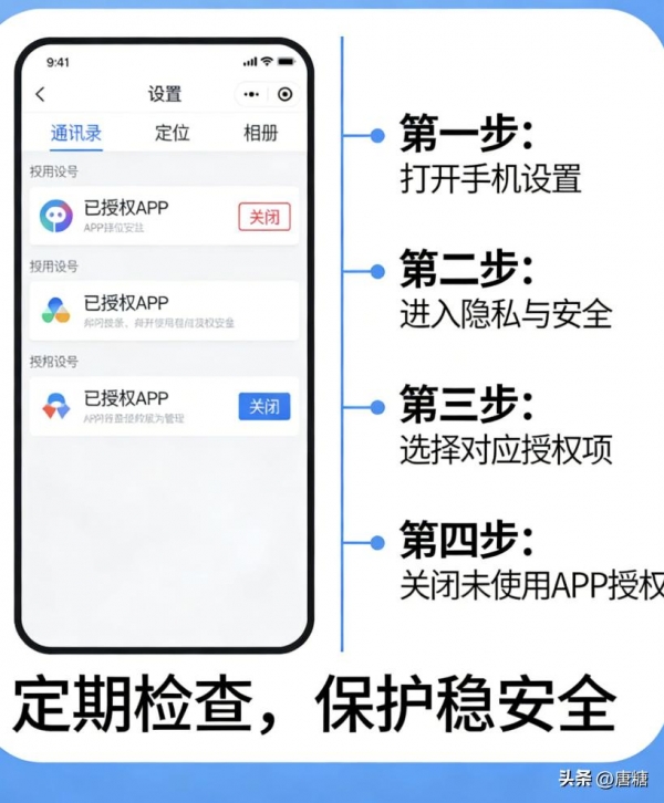 现在看下你的手机,把所有的通讯录、定位、相册授权的APP,没用的全部关掉!