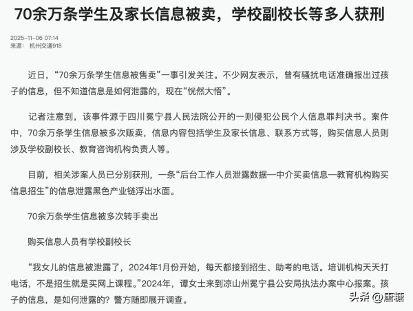 比如四川的某一学校,就有内部工作人员倒卖了70万条学生家长信息。