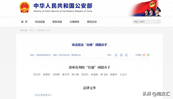 近日国台办官网新增"依法惩治'台独'顽固分子"专栏,依次列出了10名顽固"台独"分子名单,并设置了举报邮箱。这10人分别为苏贞昌、游锡堃、吴钊燮、萧美琴、顾立雄、蔡其昌、柯建铭、林飞帆、陈椒华、王定宇等。此举既是履行6月份"两高三部"发布的《关于依法惩治"台独"顽固分子分裂国家意见》的内容,也是向国际社会表明,中国解决台湾问题的立场和决定坚如磐石。