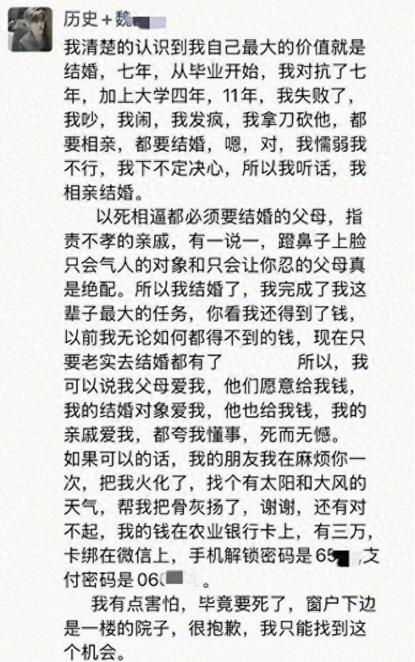 坠楼前,魏某在朋友圈留下"遗言",自述被催婚,交代了银行卡和手机密码,嘱托朋友帮其料理后事。