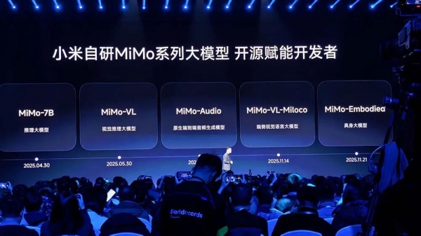在大家最关心的AI方面,小米自研MiMo系列大模型家族赫然呈现:推理大模型、视觉推理大模型、原生端到端音频生成模型、端侧视觉语言大模型、具身大模型。