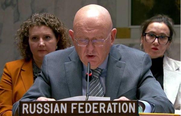 俄罗斯常驻联合国代表瓦西里·涅边贾当地时间12日在联合国安理会发言。图源:联合国